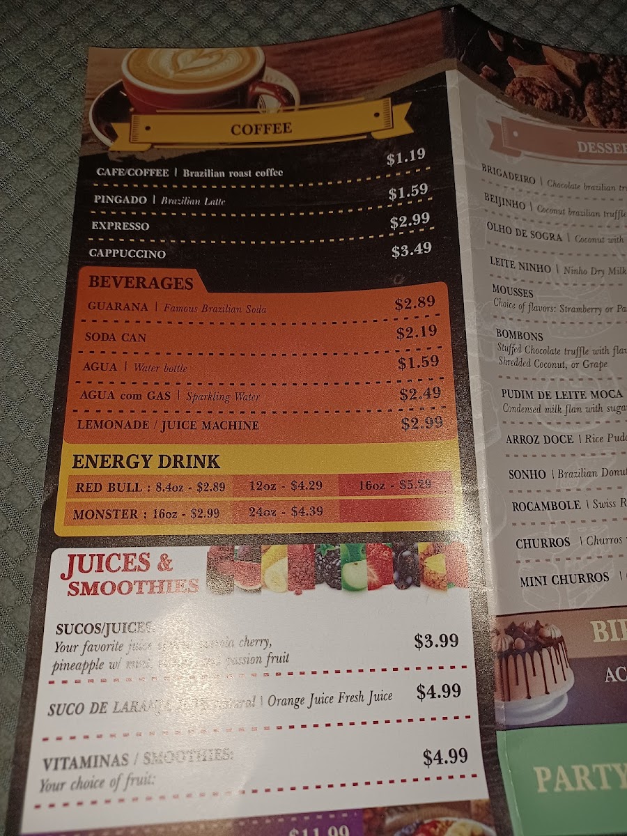 To complement the savory dishes, the beverage list features unique options like Guarana, a famous Brazilian soda that brings a bright, refreshing touch to your table. Natural fruit juices and smoothies, including fresh squeezed orange juice and passion fruit juice, add a light, vibrant contrast to the rich flavors of the meal. For those seeking an energy boost or a familiar soda, you'll also find popular choices like Monster and Red Bull available.